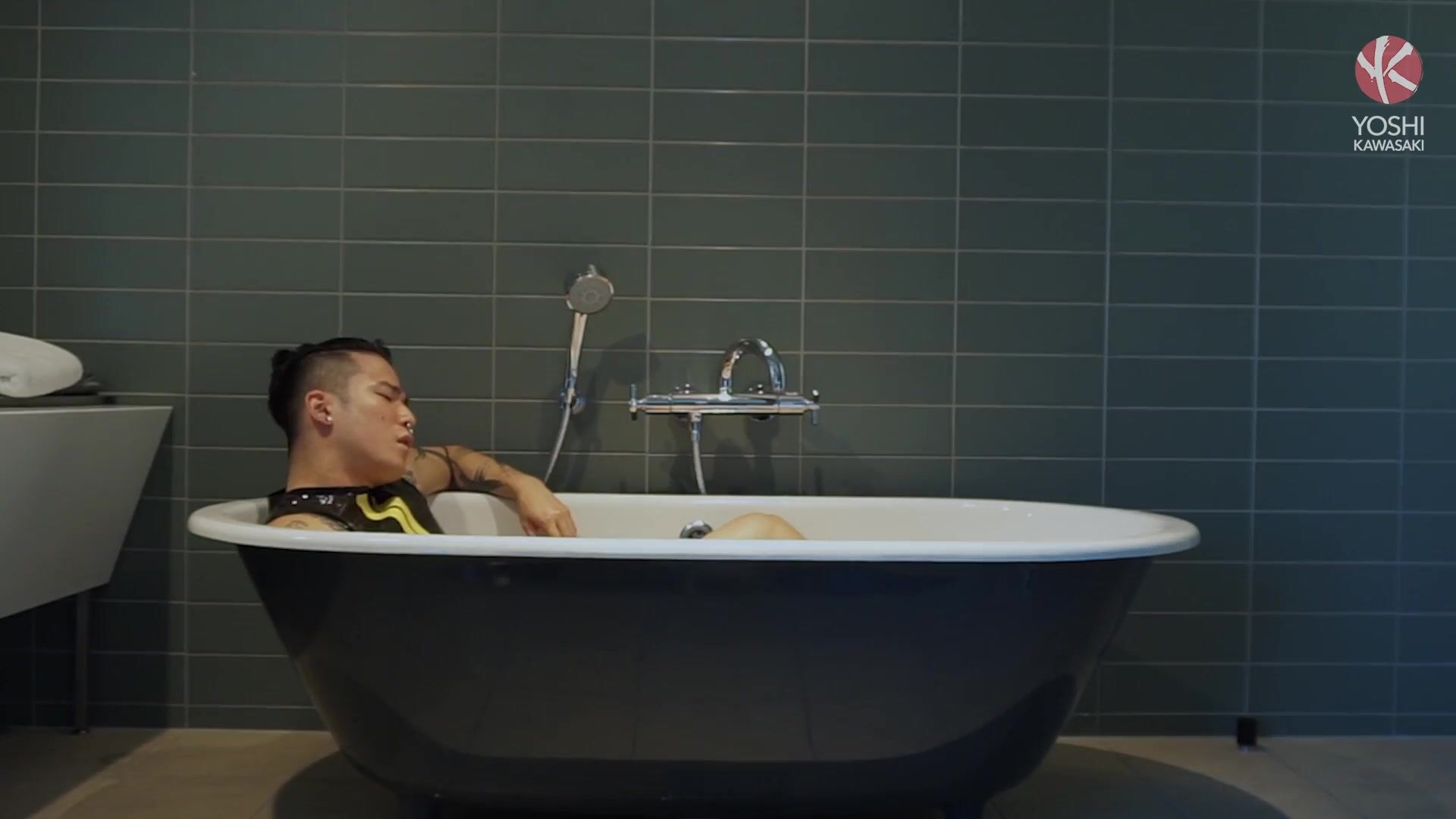 Subject Yoshi clad in tight sleeveless latex bodysuit and shorts. Today he expressed a desire to play with hole while getting soaked with piss. Rubber gear is waterproof and perfect for play session. Subject rubs glossy liquid on latex gear, enjoying sensation of rubber against his skin. Getting into bathtub, he takes up first toy, a butt plug. Pushes into hole, sliding it back and forth to warm up. Next he uses anal tunnel to lube up deep inside, allowing smooth insertion of a bigger toy. Yoshi's insatiable wet hole almost swallows the whole thing. He inserts the tunnel once more to piss into his own hole. Warm piss begins filling up subject's pussy. At the end of play session, Yoshi finishes by introducing a stream of his cum into his wet hole.