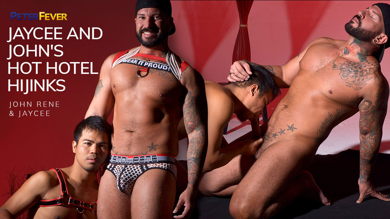 Asian beauty John Rene met Jaycee in LA, but now they are getting a chance to model together in the Arizona desert. They reminisce about the underwear shoot they did earlier and now they were off for a wilderness hike. We see some shots of their fuck scene in the hot tub and John Rene's cum shot that flew straight into Jaycee's eye.nnSexy Pinoy John is giving Jaycee a royal treatment back at the studio, oiling his skin with a luxurious massage oil and then working the kinks out of his muscles with firm strong hands. Grabbing his nuts firmly in one hand, John leans over to suck deep. He takes Jaycee's thick tool to the root and tries not to gag. Climbing up to straddle Jaycee's waist, John lubes his hole and works that dick up in. Jaycee pulls him down to kiss while John grinds his butthole into the muscle daddy's stiff prick. He lies next to Jaycee who beats his cock to a frothy cumsplosion. Sperm dripping from his face, John milks his load out onto Jaycee's tight muscular pecs.