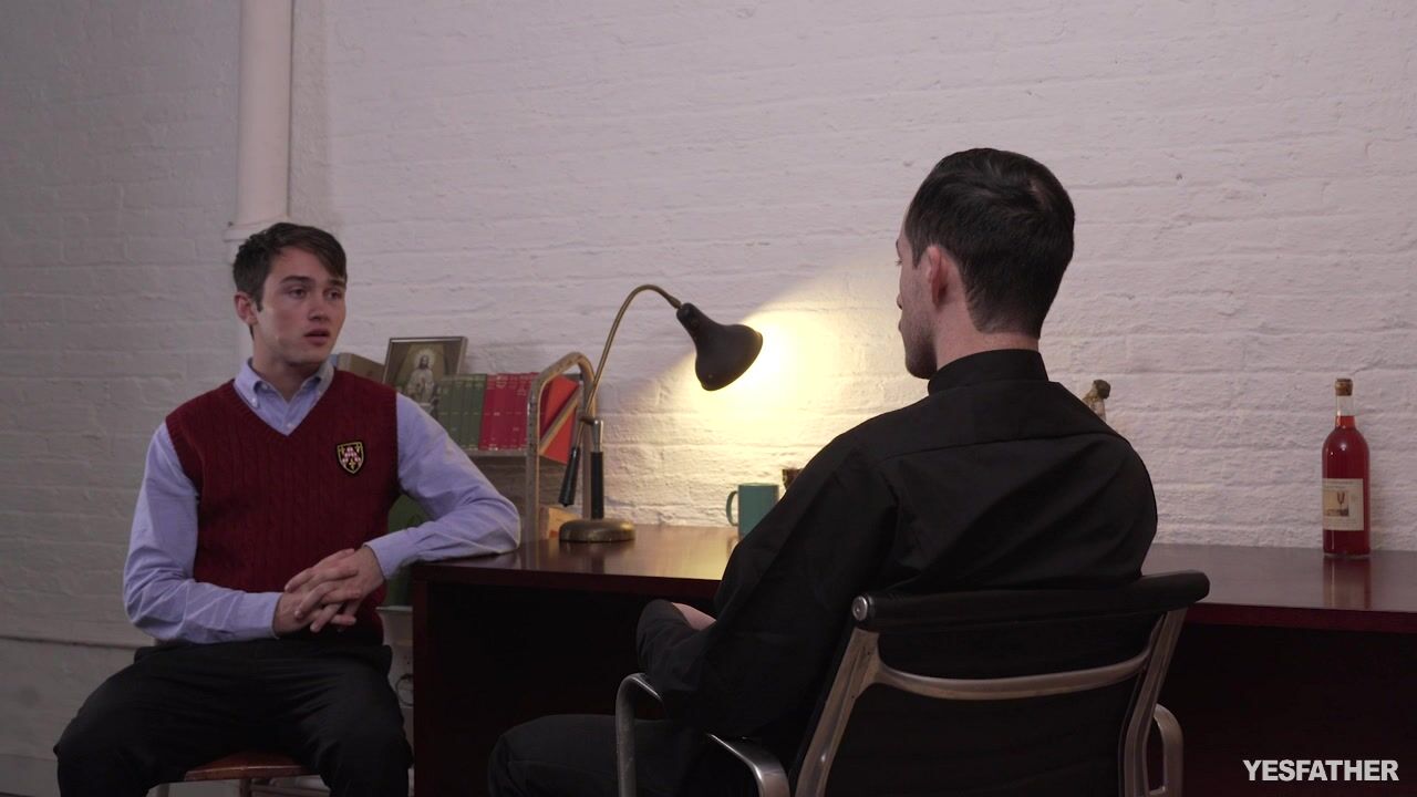 Handsome Mason is called into Father Fiore’s office to face a serious round of corporal punishment. He endures a merciless spanking and spreads his legs on the priest’s desk to take a bareback anal pounding and a hot splash of cum on his cheeks.
