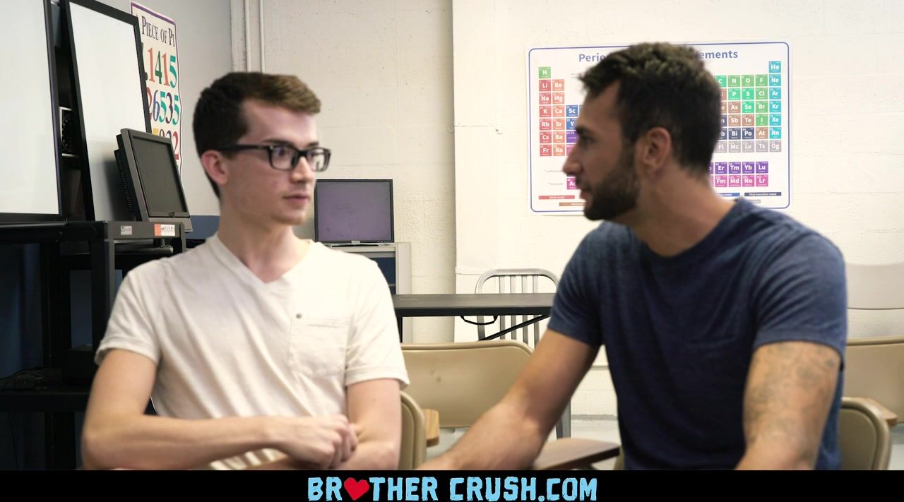 Inexperienced Alex Meyer gets caught making out with his hand by his older stepbrother, Brian Adams, while he gets ready for a date after school. To help the boy practice for his big night, the older guy slips his tongue in the kid’s mouth before stretching his tight asshole with his thick shaft in the middle of the classroom!