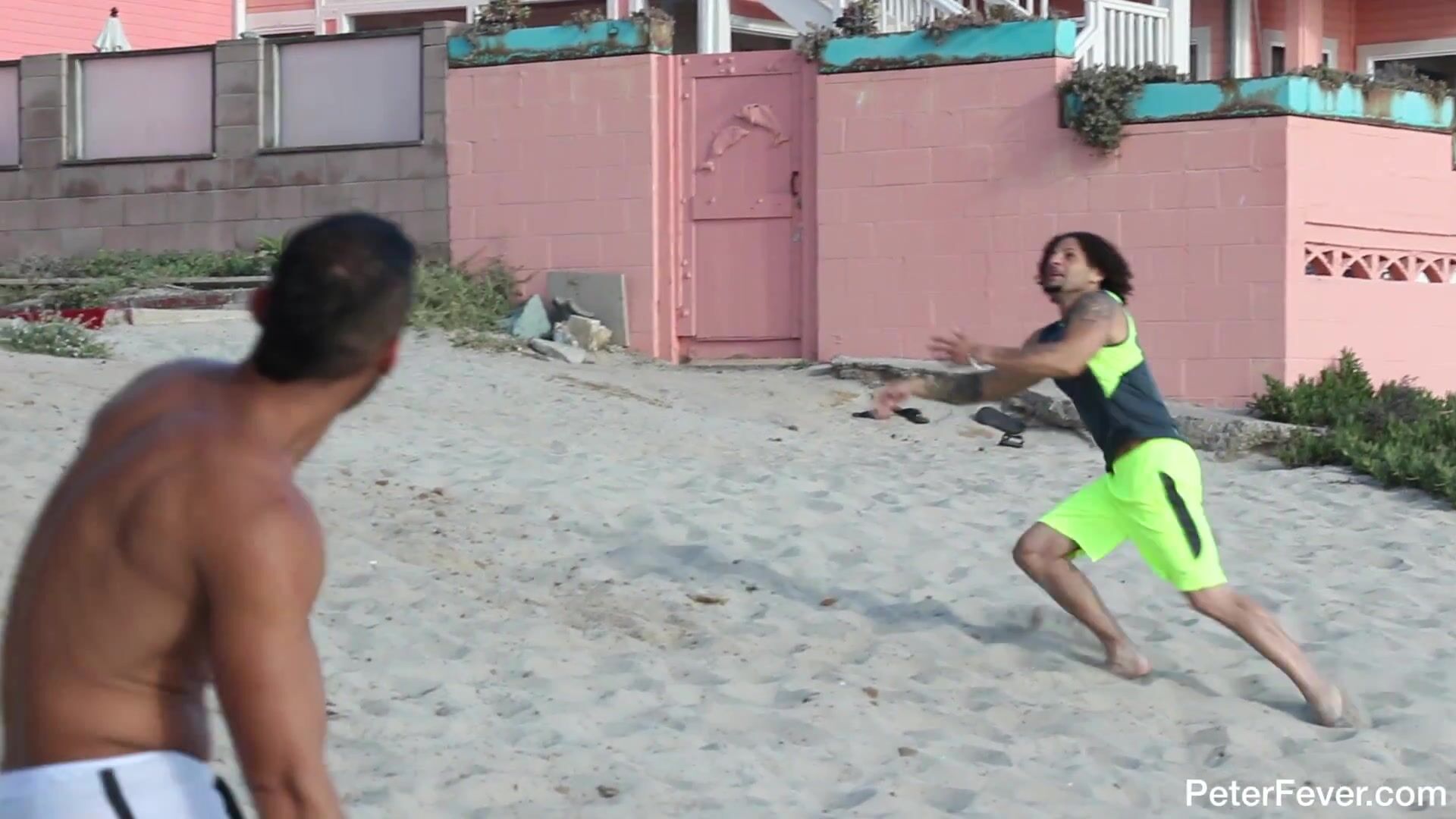 So I'm hanging out with my buddy Ty and we are playing some catch with a football on the beach. Just two guys hanging out having fun. Next thing you know, Ty throws the football and tackles me into the sand. I guess this is what they mean by football being a full contact sport! Man, having Ty throw himself on me
