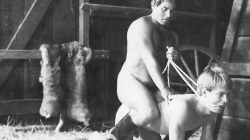 Released in 1991 with the cast of J.W. King, Chris Burns, Sky Dawson, Todd Marshall, Ray Medina, Noel Kemp, Eric Stryker. This gay sex film shows the realism and sexual intensity of burly men in action. Realism, hot fucking segments, plenty of assplay, and more! Four older, rough cowboys corner the newest, youngest member of the ranch crew in the barn and work him over. He gets slapped, spanked, verbally degraded, mouth-fucked and ass-stretched (with hard-ons and dildos) repeatedly. It soon becomes apparent that the man is a true masochist of sorts because his cock stays hard the entire time! The action and gang bang continues with endless, larger dildos, tying the man's cock and balls up with a thong, two men taking turns fucking his mouth, and all of the men jacking off and cumming all over him. They soon leave him, threatening him not to tell the farmer what just occurred.