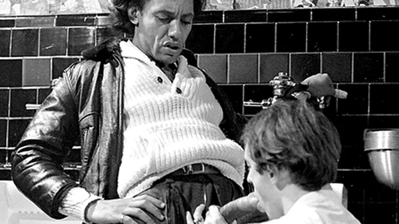 Lots of dudes are filling the men's room as the action continues. After one guy's monster cock is up, he shoves it into Malo's ass. A look at the film playing has Jayson MacBride snoozing and Jack Wagner enjoying the performance of both Big Bill Elds.