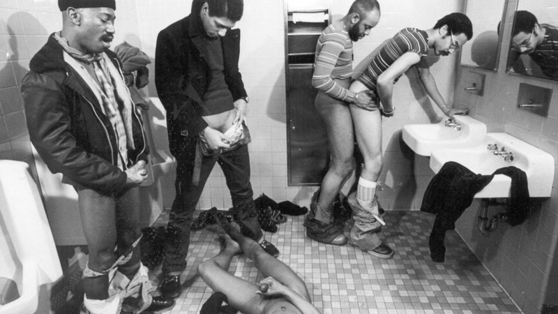 Adam and Yves make love in front of a fireplace. This scene is very, very passionate; their intimacy is beginning to show. The last sexual segment in the film is an orgy in the bathroom of presumably a black movie theater. After some naughty urinal cruising, some eight men end up entangled: fucking, sucking, and taking cum. This scene, like Bill Eld's, serves to expand the film's sexual activity beyond merely Adam and Yves. Regardless, it has got to be one of the best in terms of anonymous bathroom action, especially for those who like to watch black men get it on.