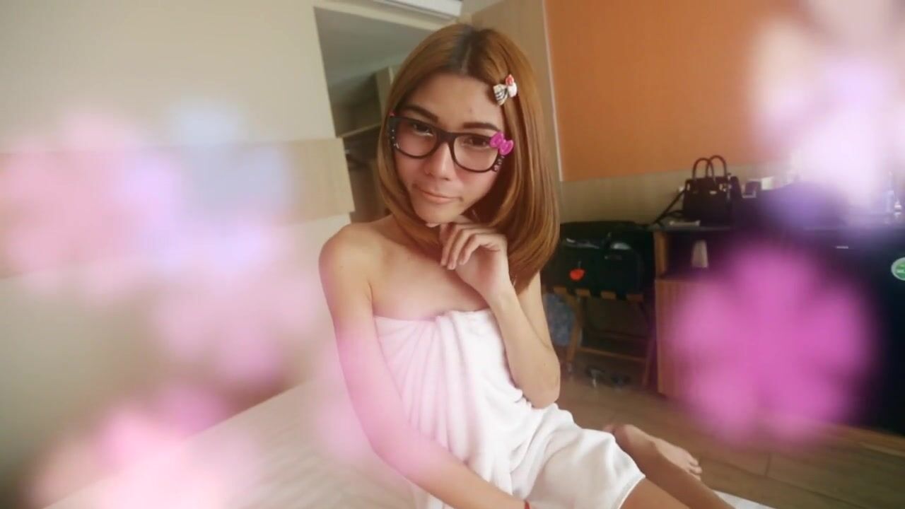 Nerdy Asian Ladyboy in glasses takes it up the ass