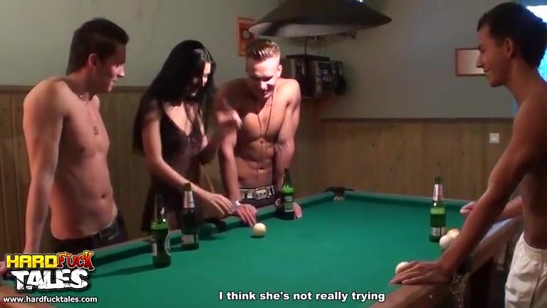 Slender brunette babe should have understood that guys are inviting her to play billiards not for a game, but for a gangbang. Juicy babe pretends not to understand that her pussy will have to work hard today and not only. Hot foursome sex awaits the girl. It's good that shaved pussy is ready for fucking.
