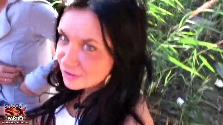 The turned on brunette student is feeling so damn boozed and excited that she thinks it absolutely normal to stay on knees and please two bone hard members at the same moment!