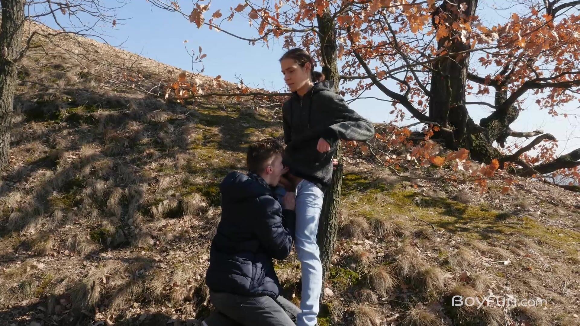 Not all boys are glued to their phone screens and computer games, some still find the time to enjoy the great outdoors and take in the natural wonder surrounding them. Adorable young couple Jake and Johnny are our for a stroll on a brisk spring morning when their urge to engage in some alfresco BoyFun takes over. Perhaps it's the romantic nature of the sprawling scenery, or maybe it's just that these two young guys can't hardly keep their dicks out of each other's mouths at the best of times? Whatever the cause, Jake is soon up against a tree with his incredibly long and deliciously hard cock in his cute lover's wet and welcoming mouth. The location is secluded enough, but the boys still have to be careful of passing walkers while they swap their delicious boners, it's perhaps no wonder the two decide to save the real action for when they get back home. The warm and plush surroundings of the bedroom allows the two to really get to work, stripping naked to reveal their smooth and tight bodies for each other, quickly becoming reacquainted with their boners as they continue to suck and lick each other in turn. After so much oral teasing it's no wonder Johnny is eager to slide his hot little hole down on his friend when Jake's long cock is offered. He rides that probing shaft with clear skill, his own cock bouncing up and down with every slip along the naked shaft. On his back for some deeper probing young Johnny is quickly on the edge of climax, his cock rigid with pleasure as their moans of ecstasy escape their lips. There's just enough stamina in the tank for the handsome lad to take a second ride on Jake's warm shaft, this time in reverse-cowboy position. Jake is in heaven, he can't hold on much longer with his buddy easing his raw hole up and down his sensitive schlong, pulling out just in time to splash his milky cream. Johnny is almost there, but the feel of Jake's spent and sticky cock sliding right back up into his well-worked teen hole is what ultimately has him erupting his own copious load over himself. It's a perfect end to a lovely stroll in the countryside.