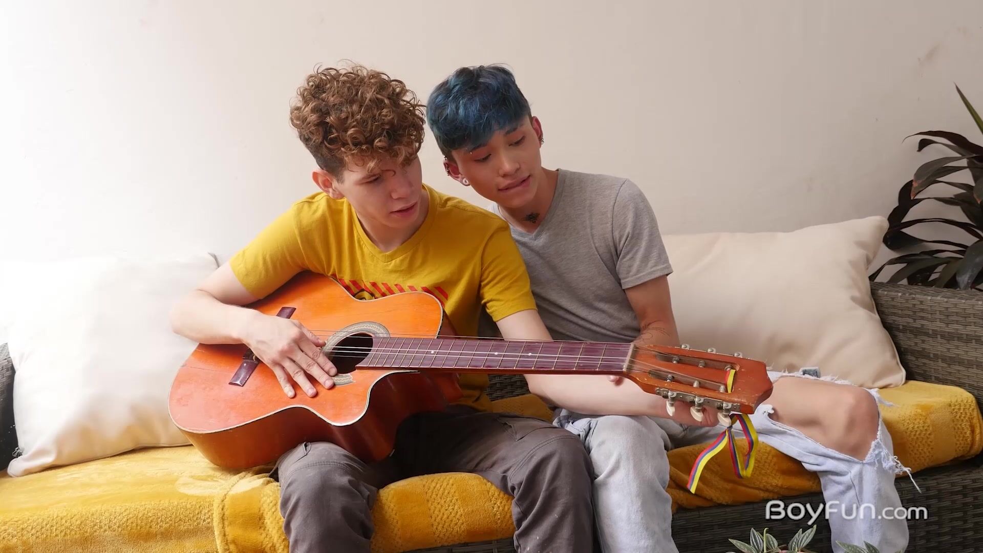Shaggy haired BoyFun twink Melo Prince is certainly no Jeff Buckley when it comes to playing guitar, but everyone has to start somewhere. Junior Jones has absolutely no idea how to make a coherent tune from the guitar either, but there are other instruments this boy knows how to play extremely well. With a little smooch the blue-haired boy is making young Melo feel much better about his lack of musical talent and it's mere moments before they're turning their attentions to their long skin flutes. Melo's impressive cock is as delicious as it looks, which Junior is eager to show as he slurps, sucks and licks the impressive pale erection springing from his pal's crotch. A quick move to the bedroom, with shirts off to display their lean and smooth bodies, rapidly rises into a concerto of penis pleasures while Melo services his pal's prick with equal vigor. These boys need no conductor to guide them in their anal delights either, and after Melo has spent a while playing Junior's hole like a trumpet he's ready to stuff his curved dong deep inside. A spooning and a deep riding has Junior's big dick swinging and flopping, but the final missionary pounding with Melo's full plump balls slapping around has the two twink stars ready for the crescendo. You'll be on pleading for an encore by the time Junior has splashed his sperm on his stomach and taken a big gushing shower of semen over his adorable face.