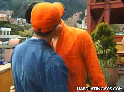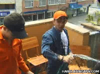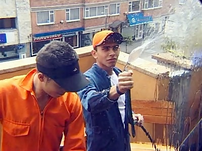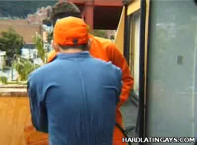 Two cute Latino window cleaners are clad in overalls and busy doing their job. One of them began taking off his clothes and took out his meaty wang and made his partner suck it off. The guy obliged and went down on his partner and gave his dick a thorough slobbering.